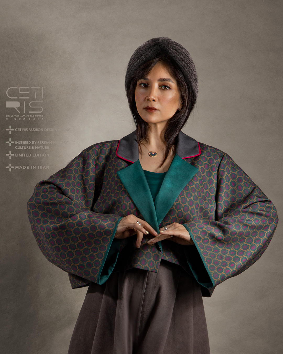 کت طرح : «سرو» از مجموعه «درخت زندگی» جنس : چاپ روی پارچه کرپ مازراتی طراحی پارچه: ستی ریس فری سایز اندازه ها قد : ۴۵ سانتی متر دور سینه : ۱۶۰ سانتی متر آستین : ۵۱ سانتی متر + سرشانه ۲۰ سانتی متر