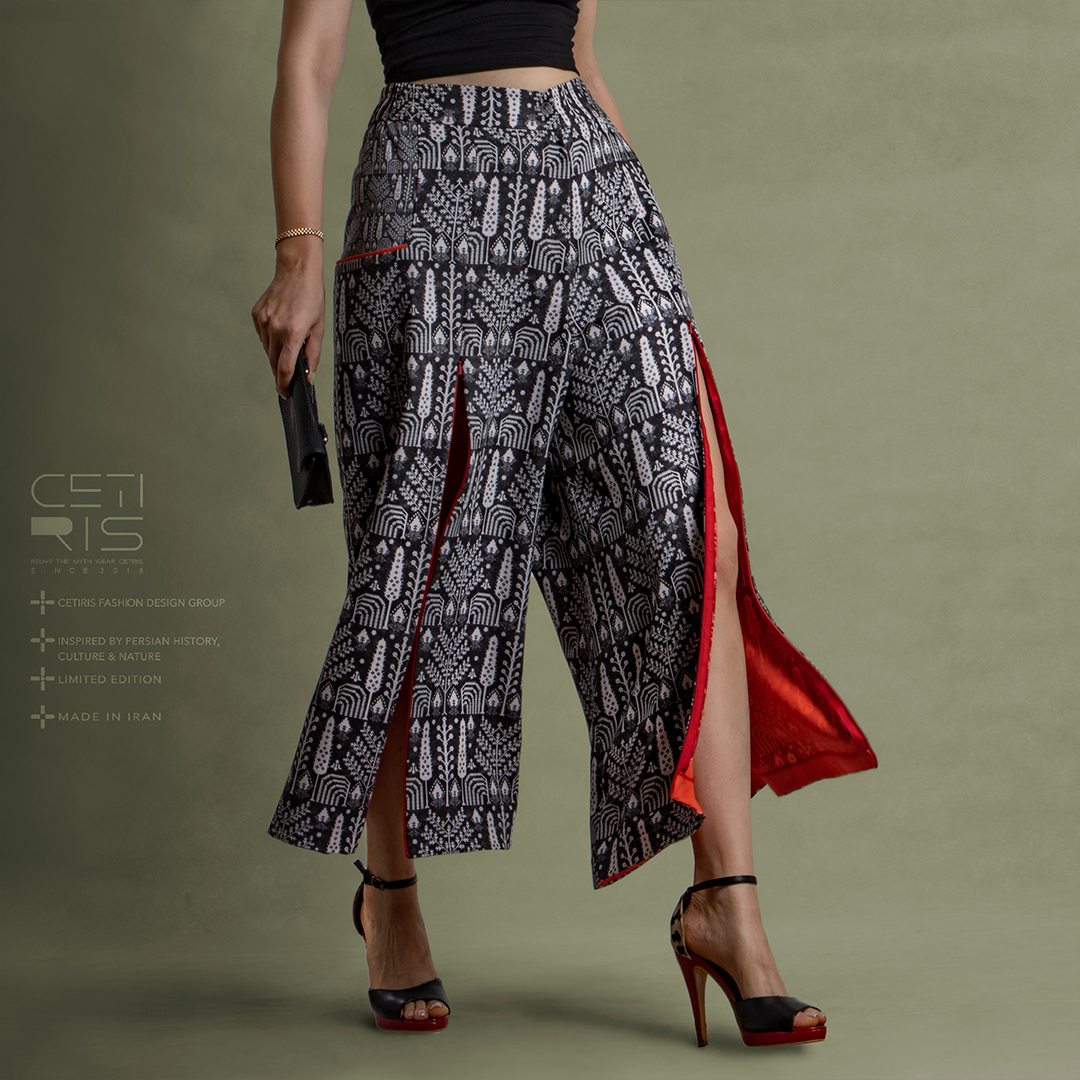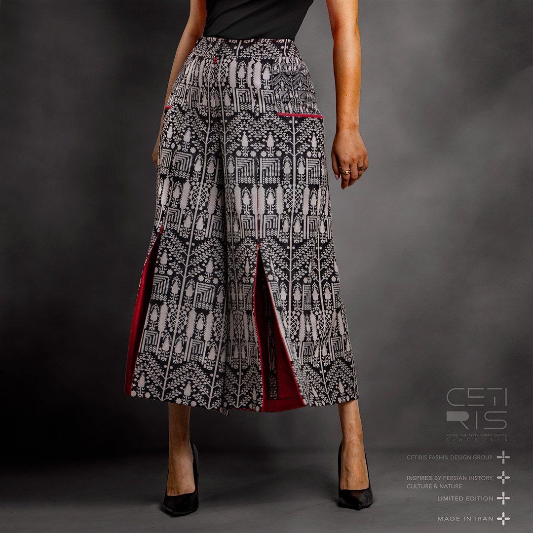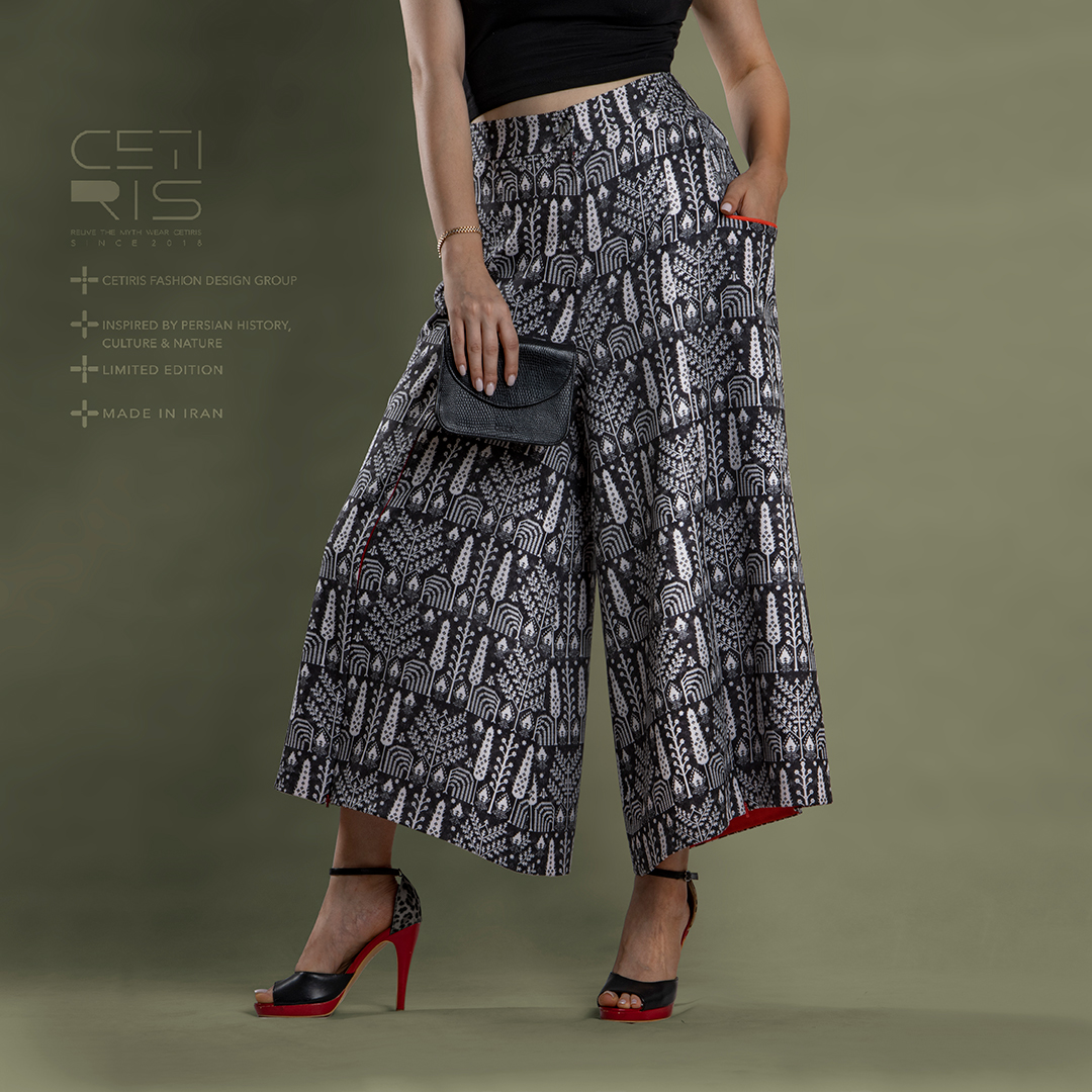 شلوار مدل «افسون» طرح «بیجار» طراحی پارچه : ستی ریس جنس : چاپ روی پارچه کرپ مازراتی طراحی پارچه : ستی ریس قد : ۹۰ سانتی متر