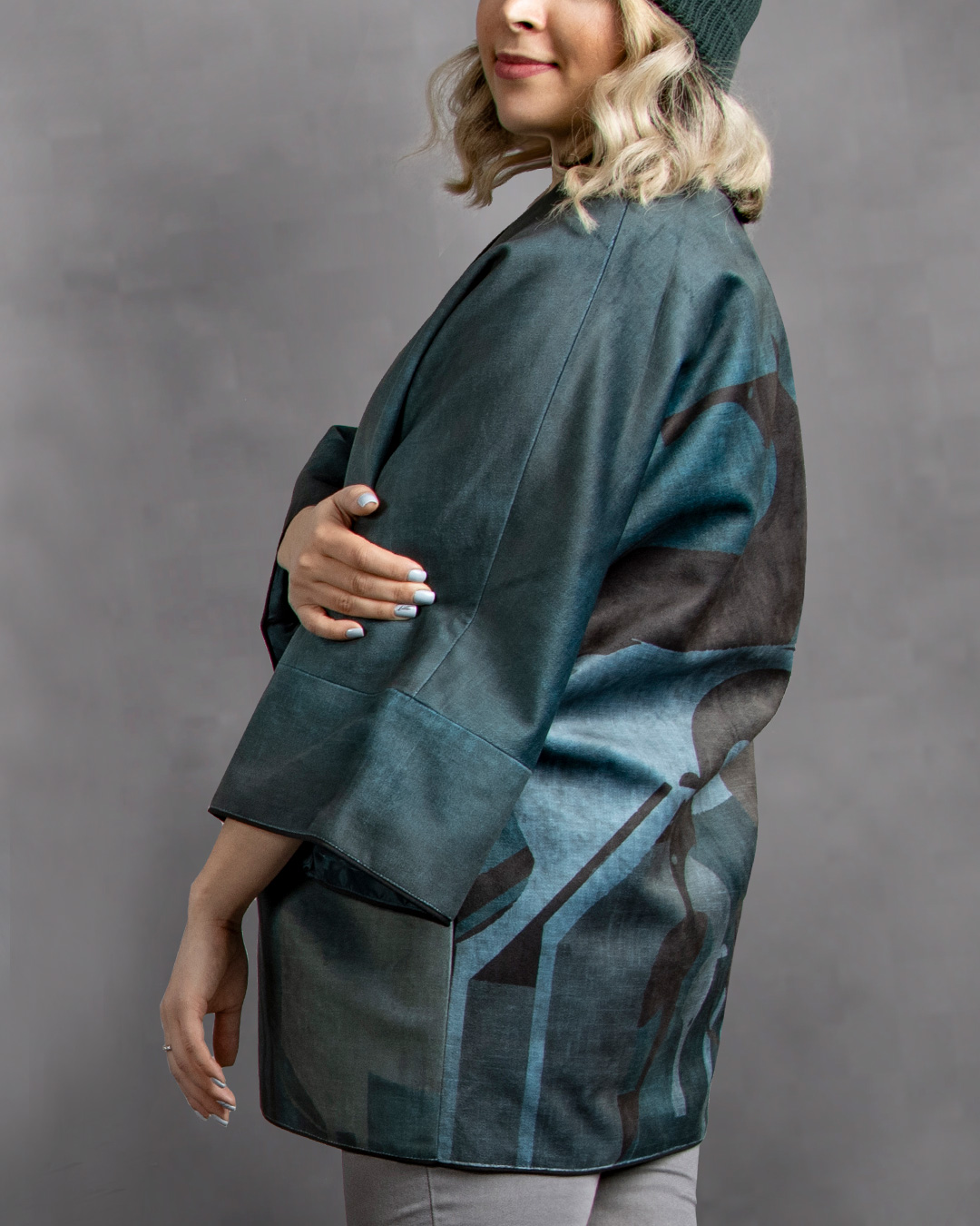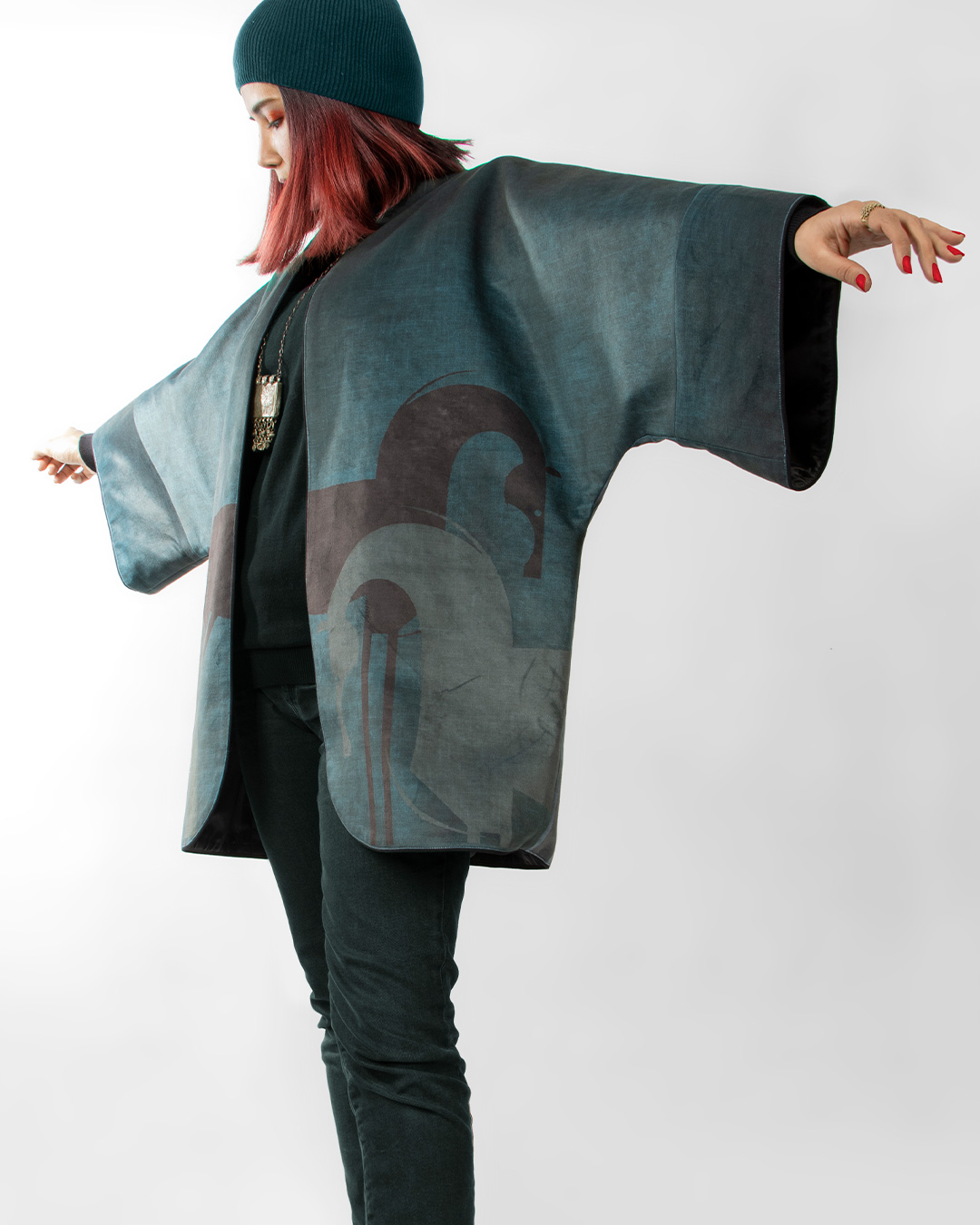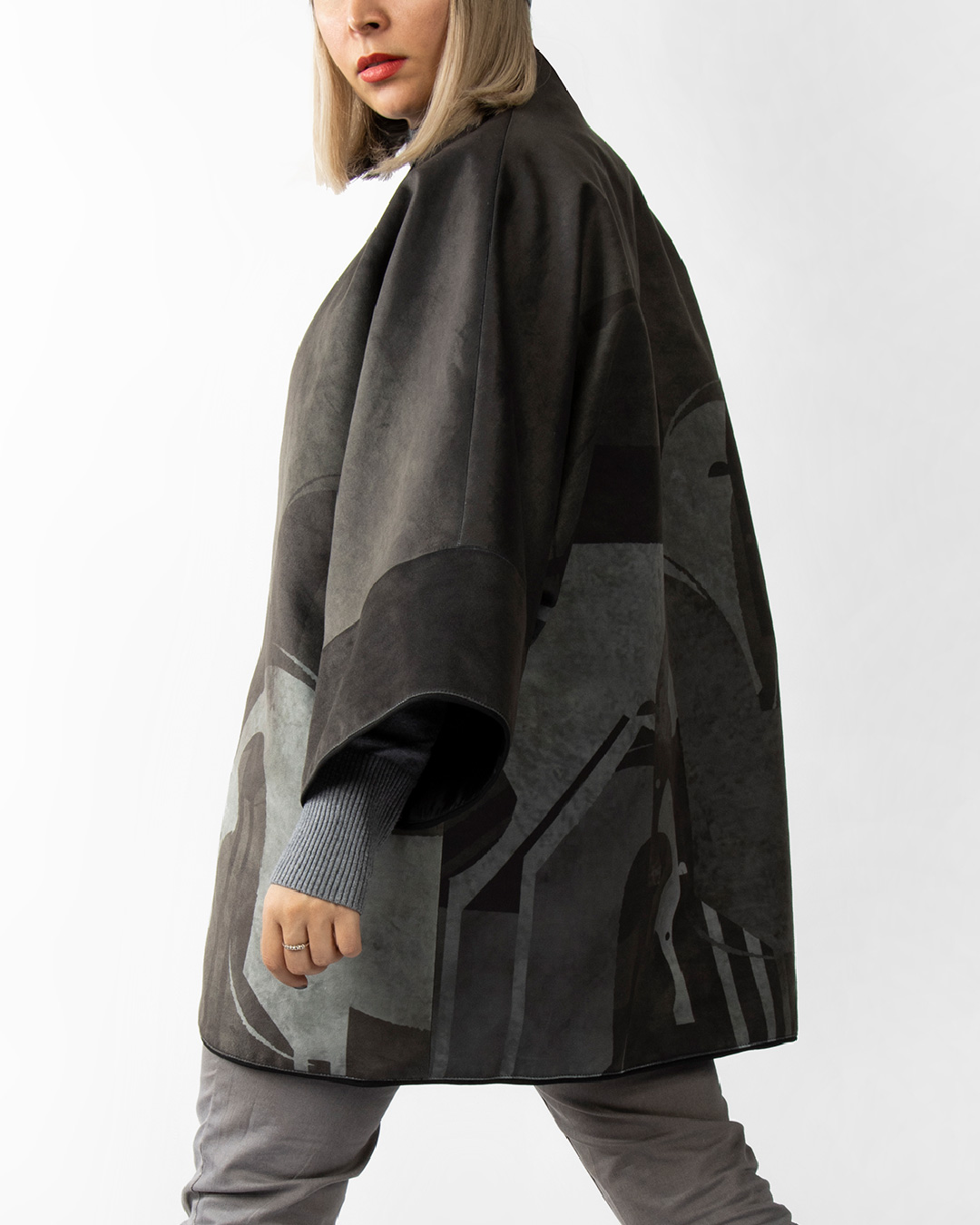کیمونو طرح : «اسب نسایی» از مجموعه «میراث» جنس : چاپ روی پارچه مخمل با آسترشمعی طراحی پارچه: ستی ریس فری سایز
