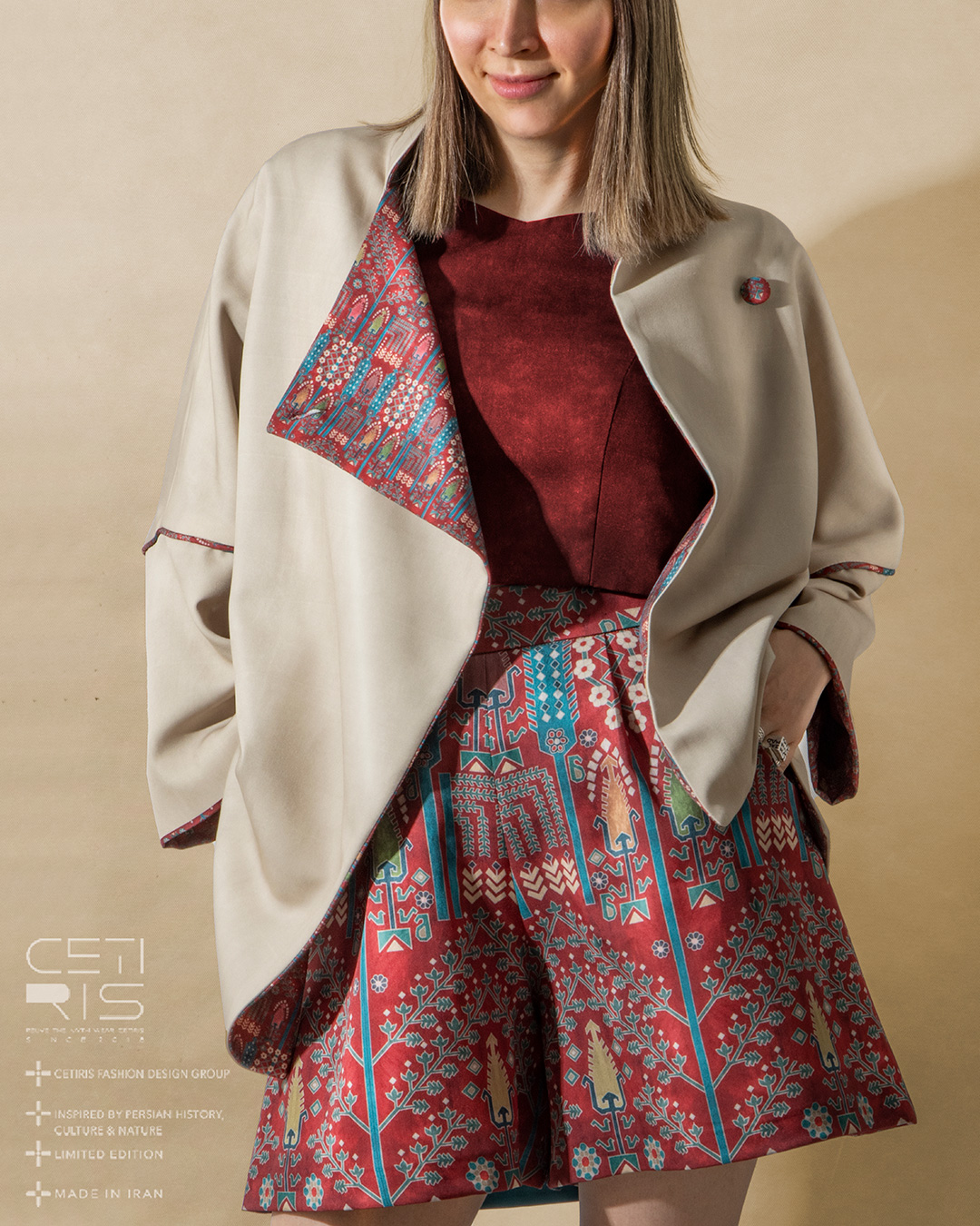 کت طرح : «شیدا» از مجموعه «مکمل» طرح داخل کار: بیجار زرشکی جنس : چاپ روی پارچه کرپ مازراتی با آستر الیزه طراحی پارچه: ستی ریس فری سایز ۳۶ تا ۴۲ قابل ست شدن با شلوار و شلوارک بیجار زرشکی مدت زمات تولید: ۱۴ روز کاری